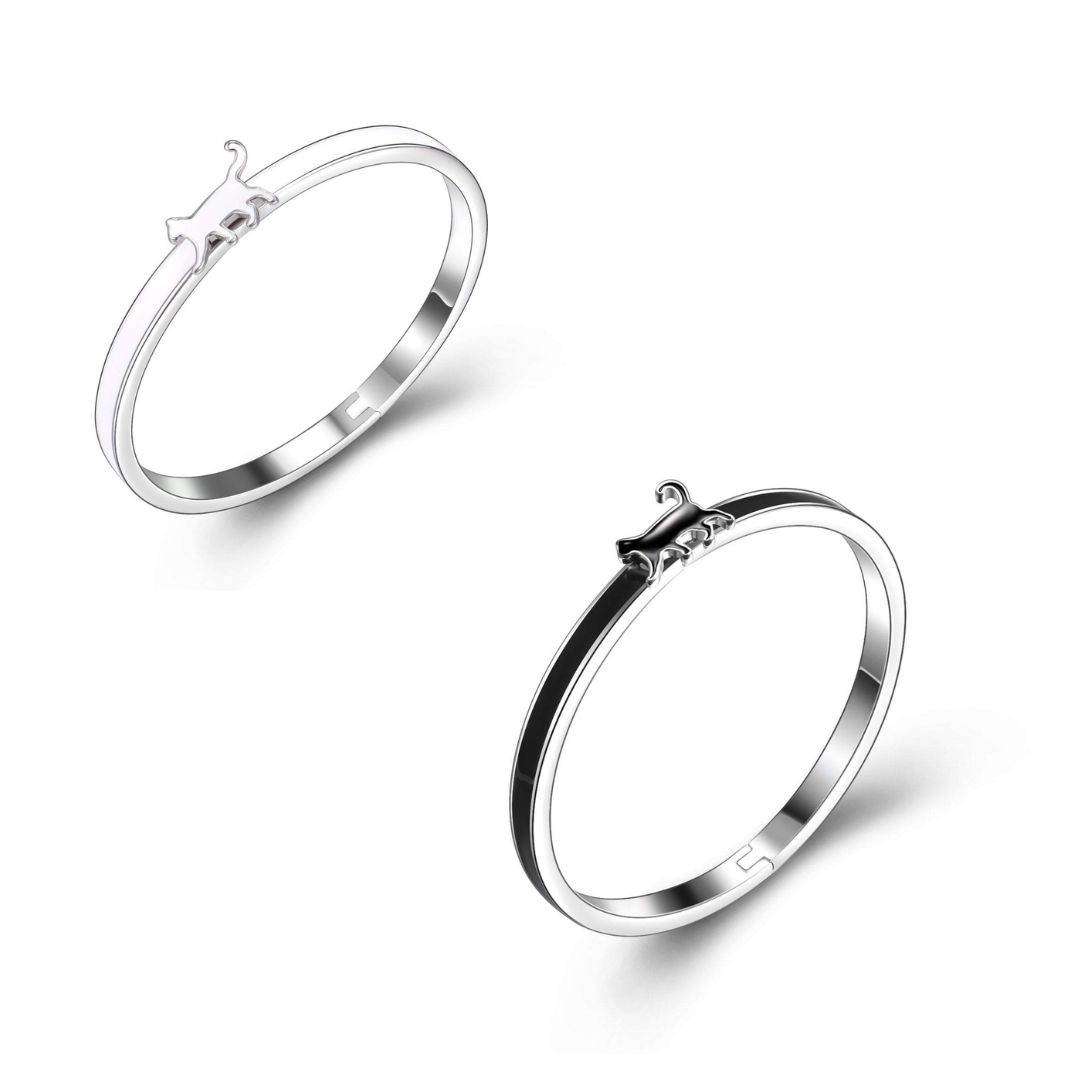 Meet your new favorite wrist accessory—a charming black cat enamel bangle that's as practical as it is adorable. This Triple T Studios original features a hinged design with a hidden latch beneath the cat, making it effortless to slip on and off. Crafted from sleek black enamel with silver-plated accents, it strikes the perfect balance between subtle sophistication and playful feline charm. With a 7.5" circumference and 2.7" interior width, it fits most wrists comfortably. Perfect for cat enthusiasts who appreciate understated style with personality.